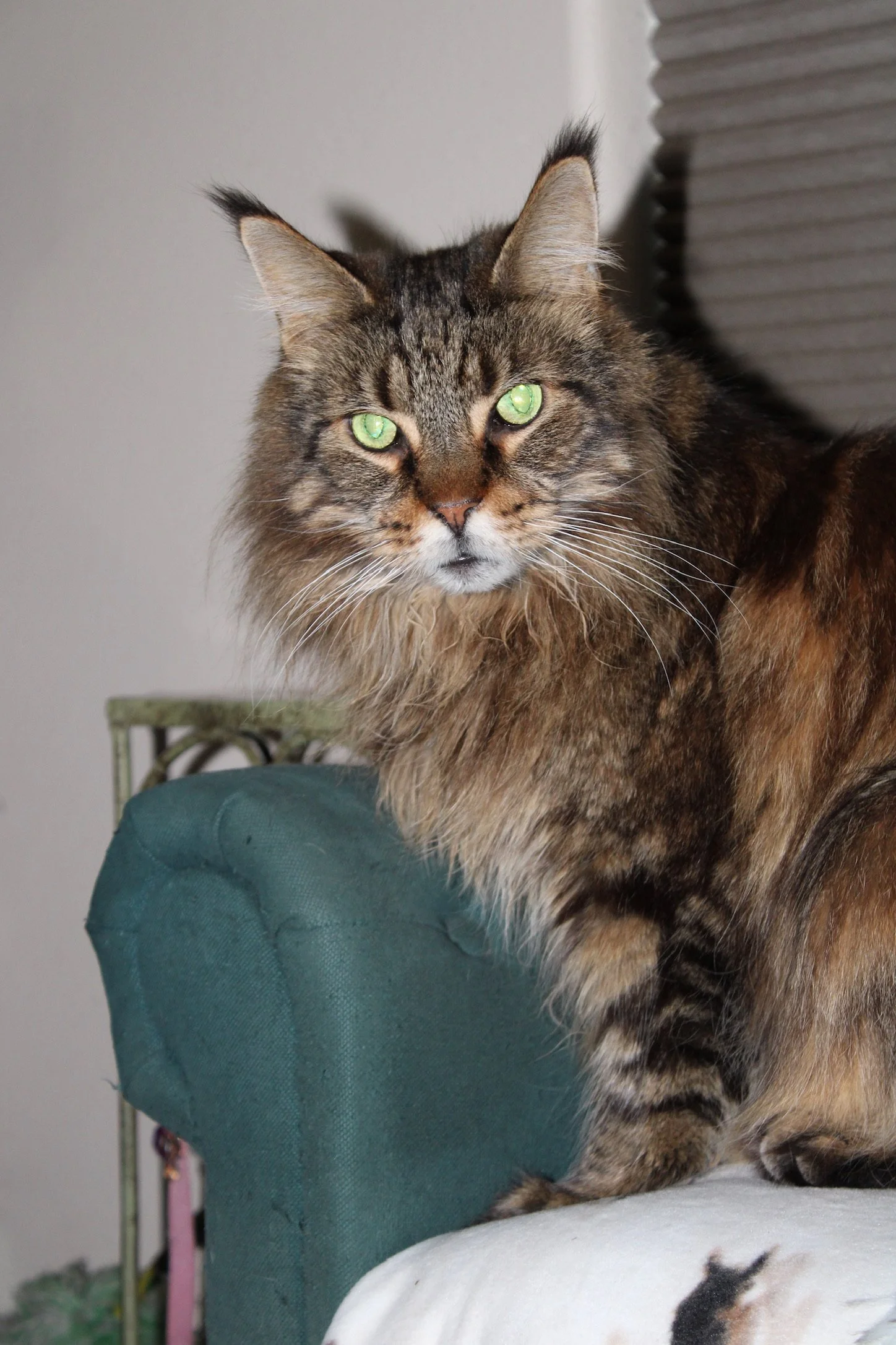 This has been a dream of mine for years. I have always loved many breeds of cats, from Persians and Himalayans to Ragdolls and Maine Coons. It has been a long-standing ambition of mine to breed and show felines. Once I was fortunate enough to have a Maine Coon join my family, I knew they were one of the best breeds due to their playful, loving, and adventurous nature. My first Maine Coon, Masuka, was a big classic black tabby with deep green eyes. He loved everyone he met, was always curious about his surroundings, and was eager to meet new people.